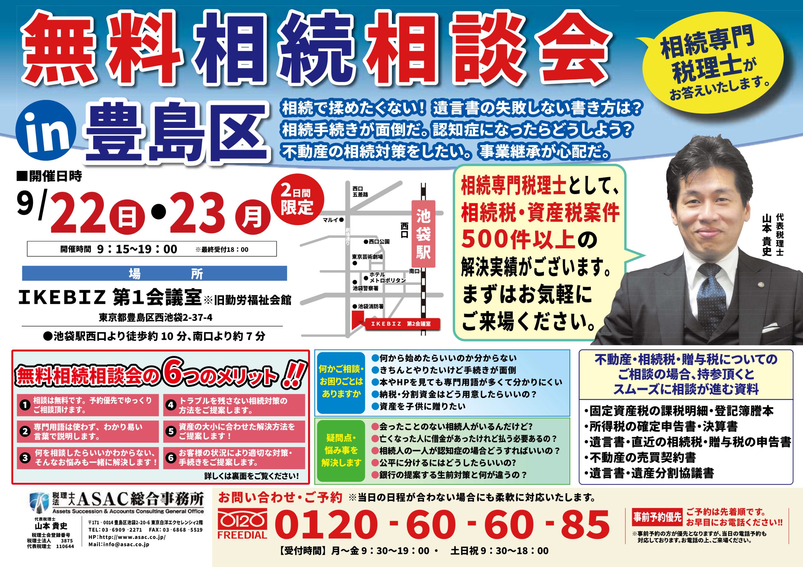 9月22日(日)・23日(月)IKE・BIZ(としま産業振興プラザ)にて相続相談会を開催します。 2024年7月29日 お知らせ 場所:イケビス 第一会議室 日時:令和6年9月22日(日)・23日(月)9:15~19:00 予約制となっております。 お問合せ・ご予約は 0120-60-60-85 受付時間 月~金9:30~19:00 土・日・祝9:30~18:00 URL Copied!